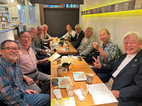 今回の企画は、近在の長谷川健郎氏にお願いし案内してもらいましたが、お楽しみの飲み会も、よく来るという蕎麦屋さんでした。我々10名が入れば満杯ほどの小さい店で午後1時の予約が先客が満杯で、一寸待たされましたが、料理はなかなかで、特に蕎麦は、一寸独特のおいしさでした。酒は焼酎の銘柄がそろっていて大いに盛り上がりました。